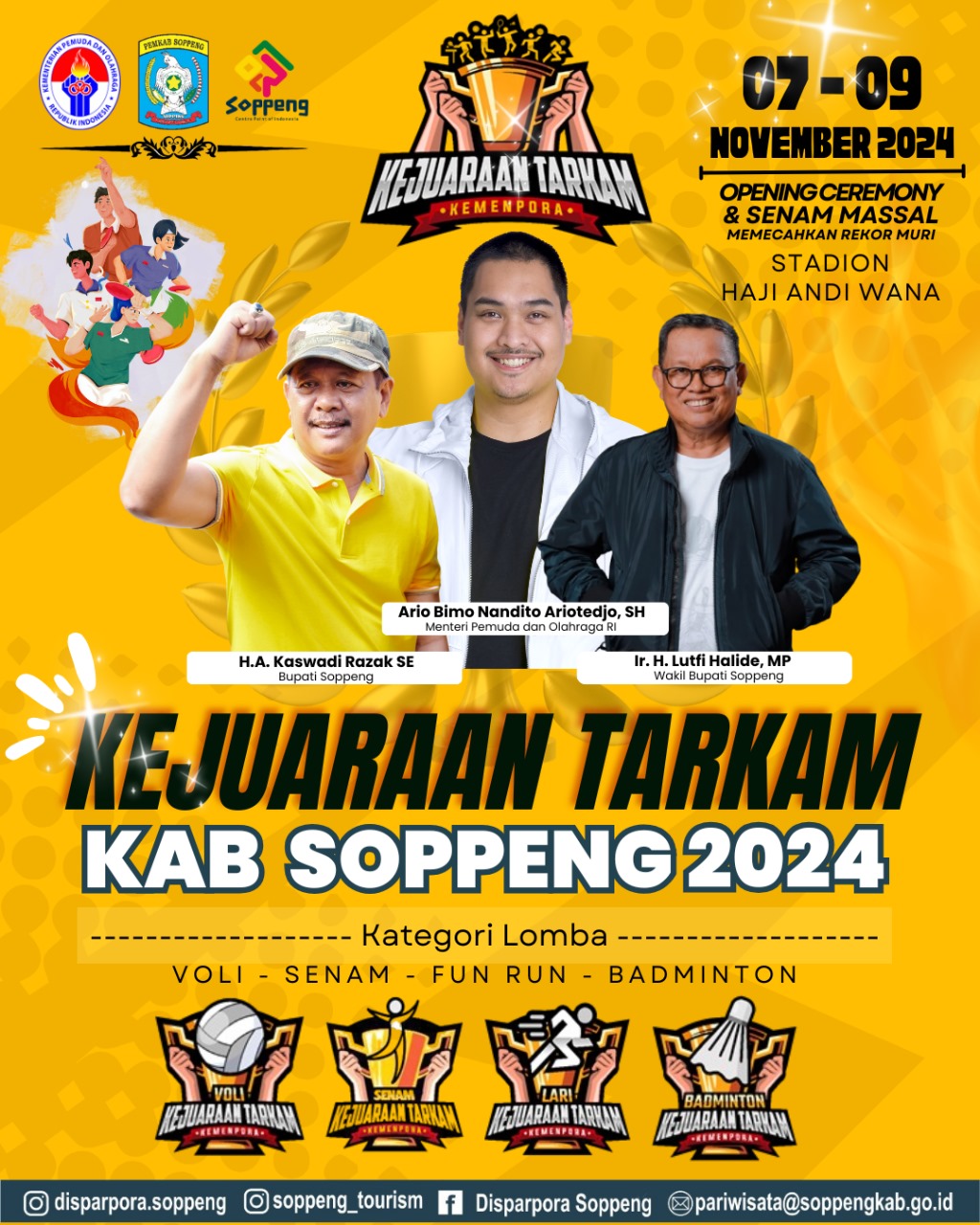 Oahraga diharapkan tidak hanya bagi warga yang tinggal di kota-kota besar, bukan milik warga yang sudah terlatih, bukan klub klub olahraga atau suatu golongan tertentu, tapi olahraga untuk semua (Sport for All) yang dapat menjadi pemersatu bangsa karena itu, yuk uji nyali dan kemampuan kita dalam Tarkam Soppeng 2024- Pelaksana Event: Dinas Pariwiata, Kepemudaan dan Olahraga