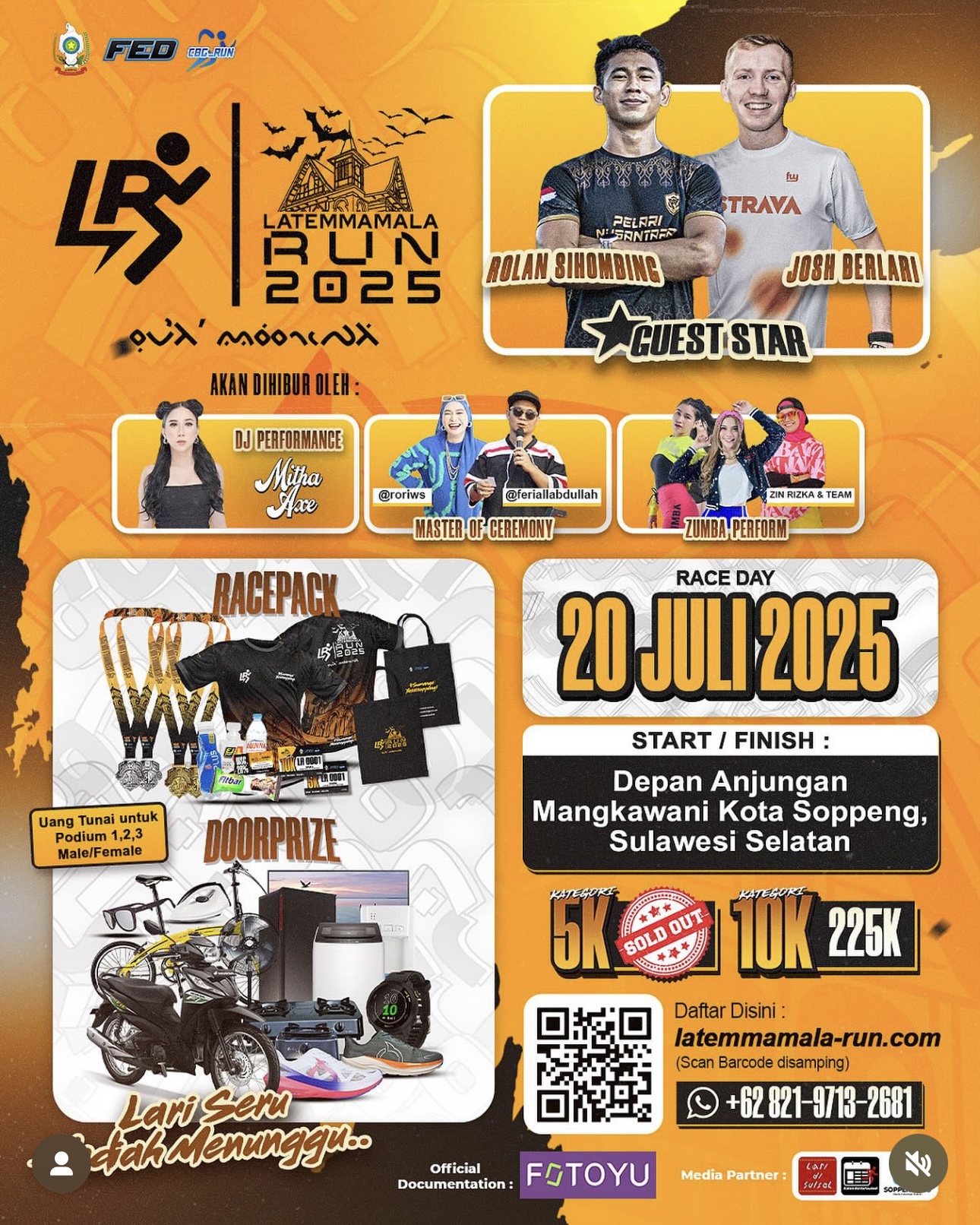 Latemmamala Run 2025 bukan sekedar event lari tapi juga menghadirkan zumba, music dan influencer lari terkenal yakni Rolan Sihombing. Start dan Finish depan Anjungan I Mangkawani dengan hadiah menarik mulai 750rb hingga 2jt, jangan sampai kehabisan slot yah, see you thereā¦.- Pelaksana Event: Latemmamala Run